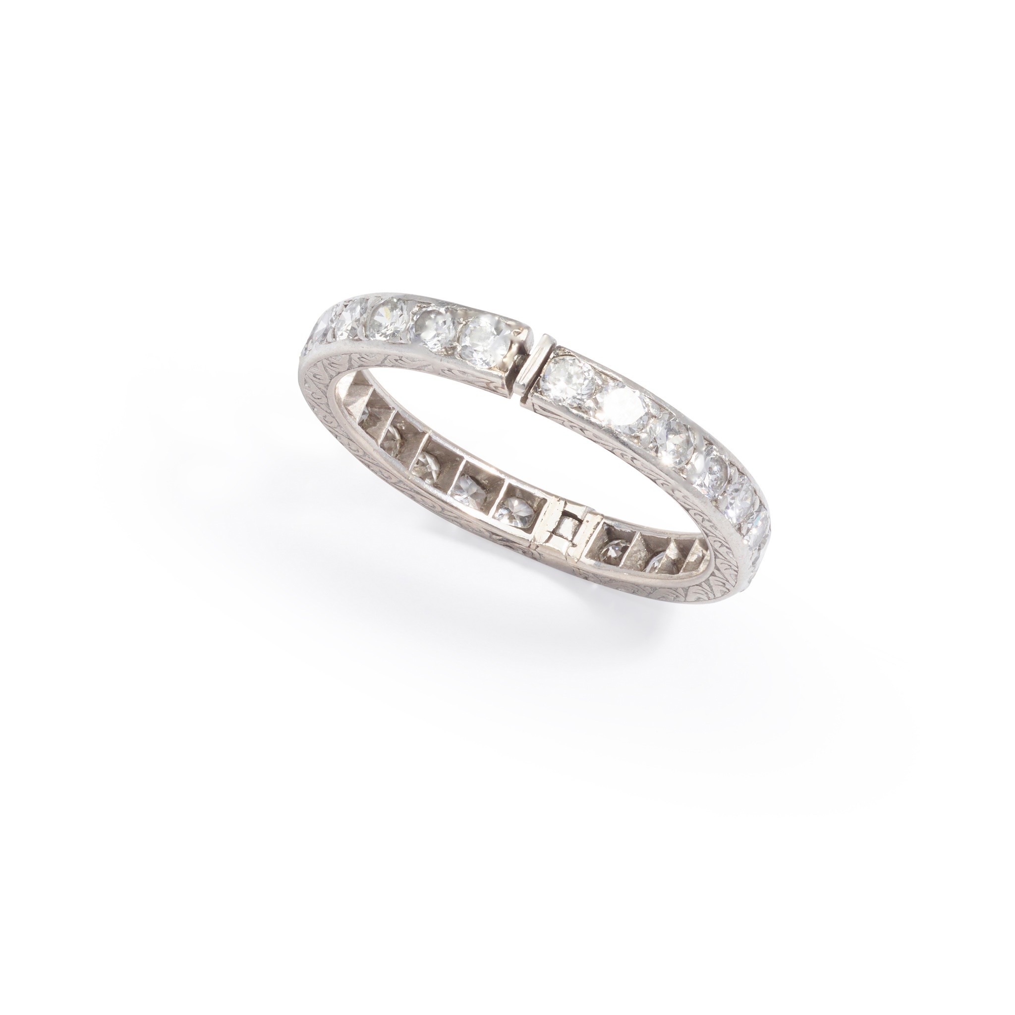 The hinged band with clasp, set with a continuous row of old brilliant-cut diamond, to a scroll design gallery