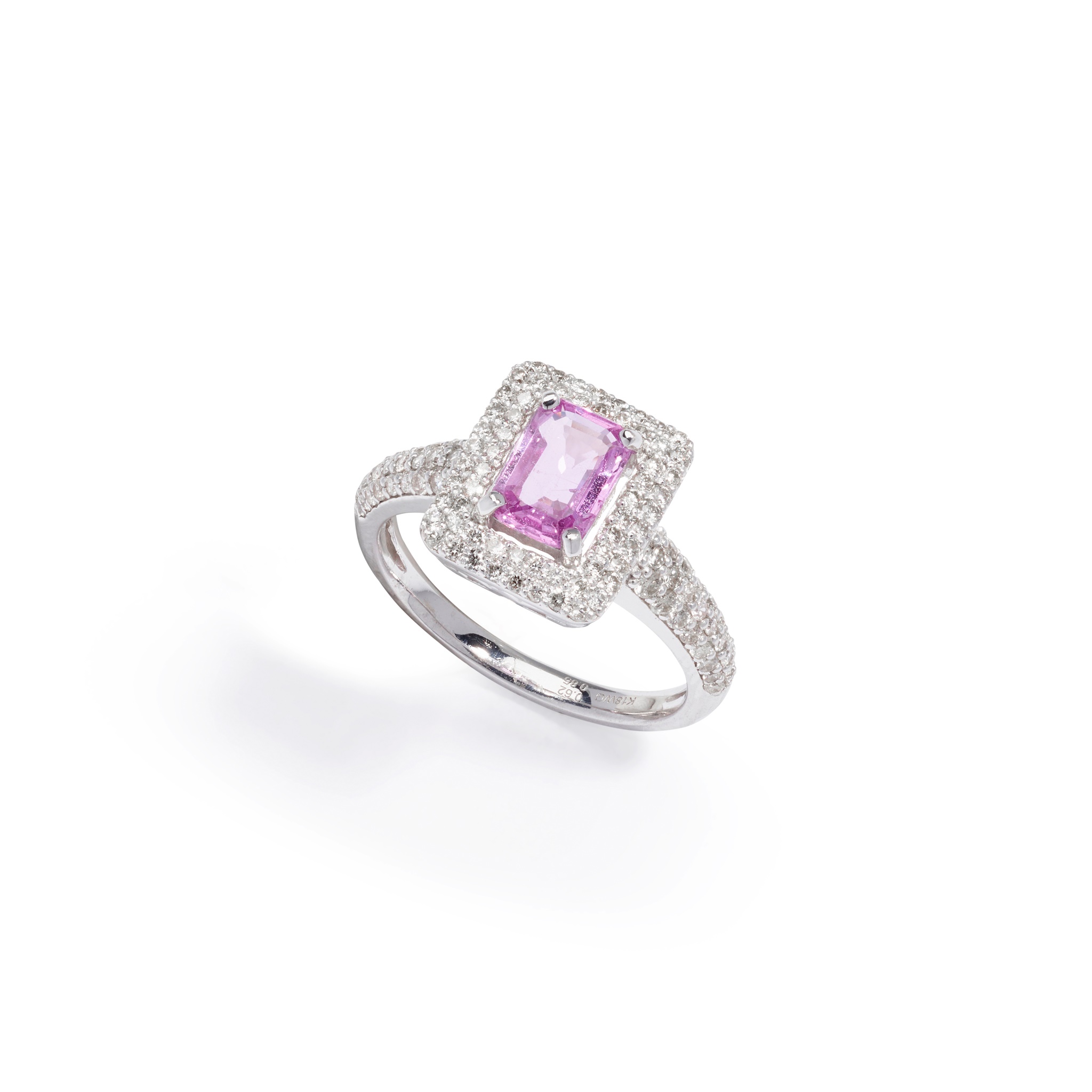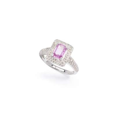 The cut-cornered step-cut pink sapphire to a pavé-set brilliant-cut diamond surround and shoulders