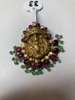 Modelled as an 18ct gold Hindu deity, surmounted by and suspending a line of cabochon rubies and rose-cut diamonds, to an emerald bead tassel fringe, UK hallmark