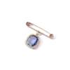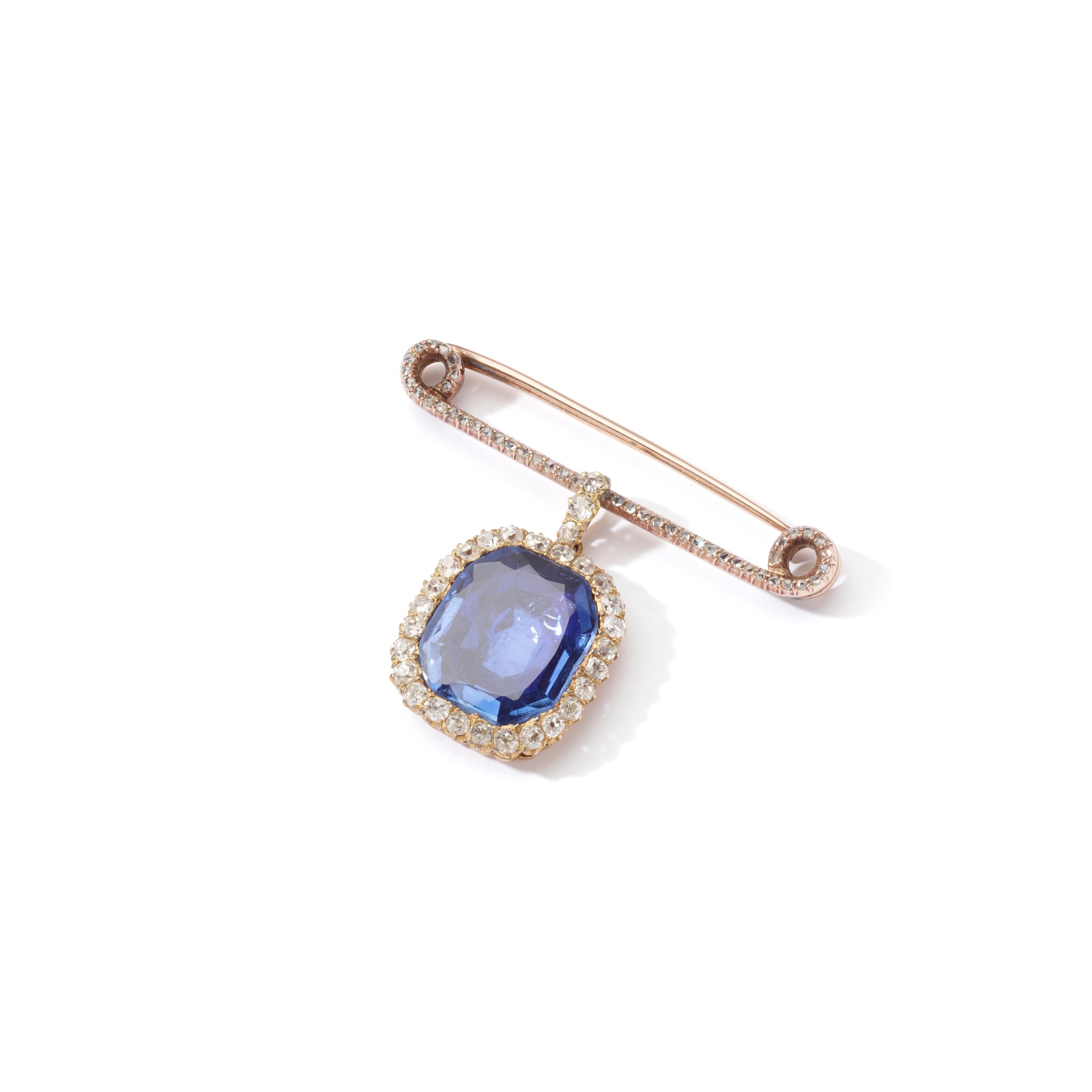 Designed as a rose-cut diamond safety pin, suspending a cut-cornered step-cut sapphire in a foiled closed back mount, within an old-cut diamond surround and surmount