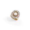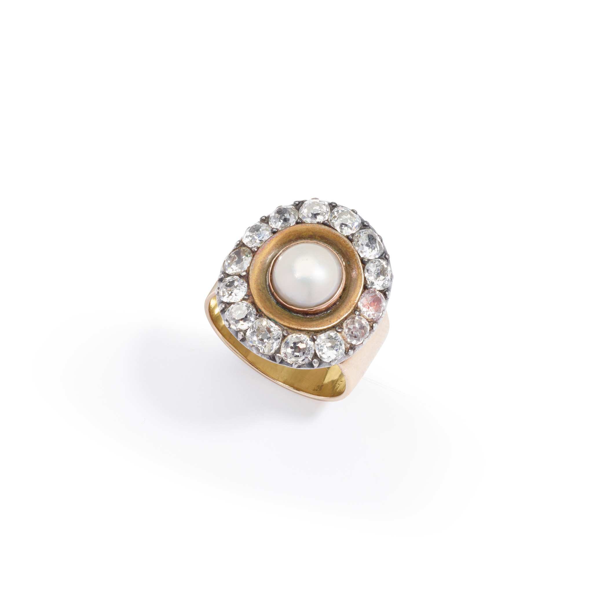 Collet-set with a half pearl within an old brilliant-cut diamond surround, to a later band