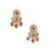 Each designed as an openwork circlet suspending a bow with three drops, each set with a circular or oval-cut sapphire, within a seed pearl surround with ropetwist detail, hook fittings, a few seed pearl sections deficient