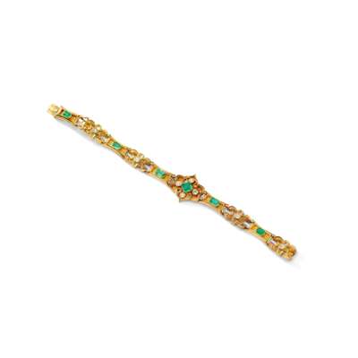 Centrally-set with a step-cut emerald within a repoussé cartouche accented with old brilliant-cut diamonds, between alternating scroll and concave rectangular links set with either an old brilliant-cut diamond or a rectangular step-cut emerald, later alterations to additional link/clasp, in fitted case by J & T Turner, Jewellers to the Queen & Royal Family, 58&59 New Bond Street, London
