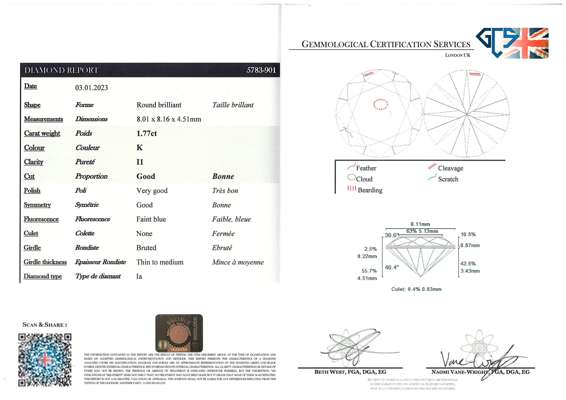 Accompanied by a GCS certificate stating that the diamond, weighing 1.77ct, is K colour, I1 clarity, with faint blue fluorescence. Report no. 5783-901, dated 3rd January 2023.