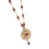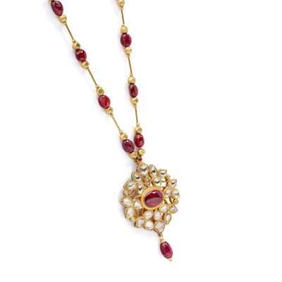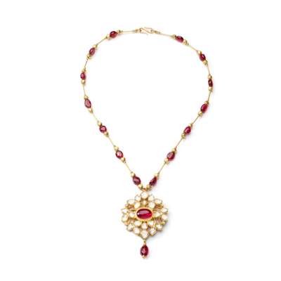 The oval cabochon ruby within an openwork surround set with flat-cut diamonds, all in foiled closed-back mounts, the reverse with multi-coloured enamel, suspended from a bar and bead-link chain intersperseds with tumble-shaped ruby beads