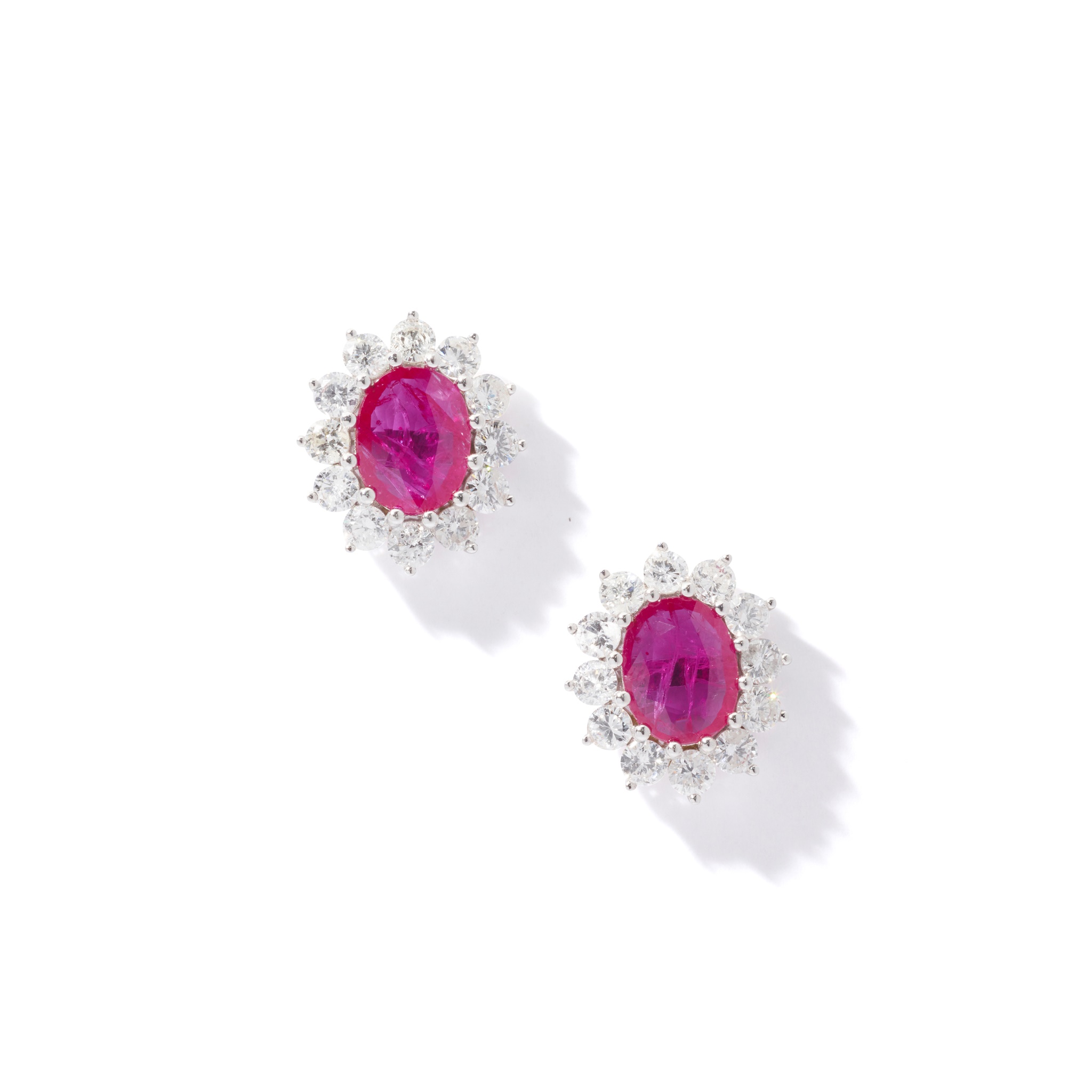 Each oval-cut ruby within a brilliant-cut diamond surround, post fittings