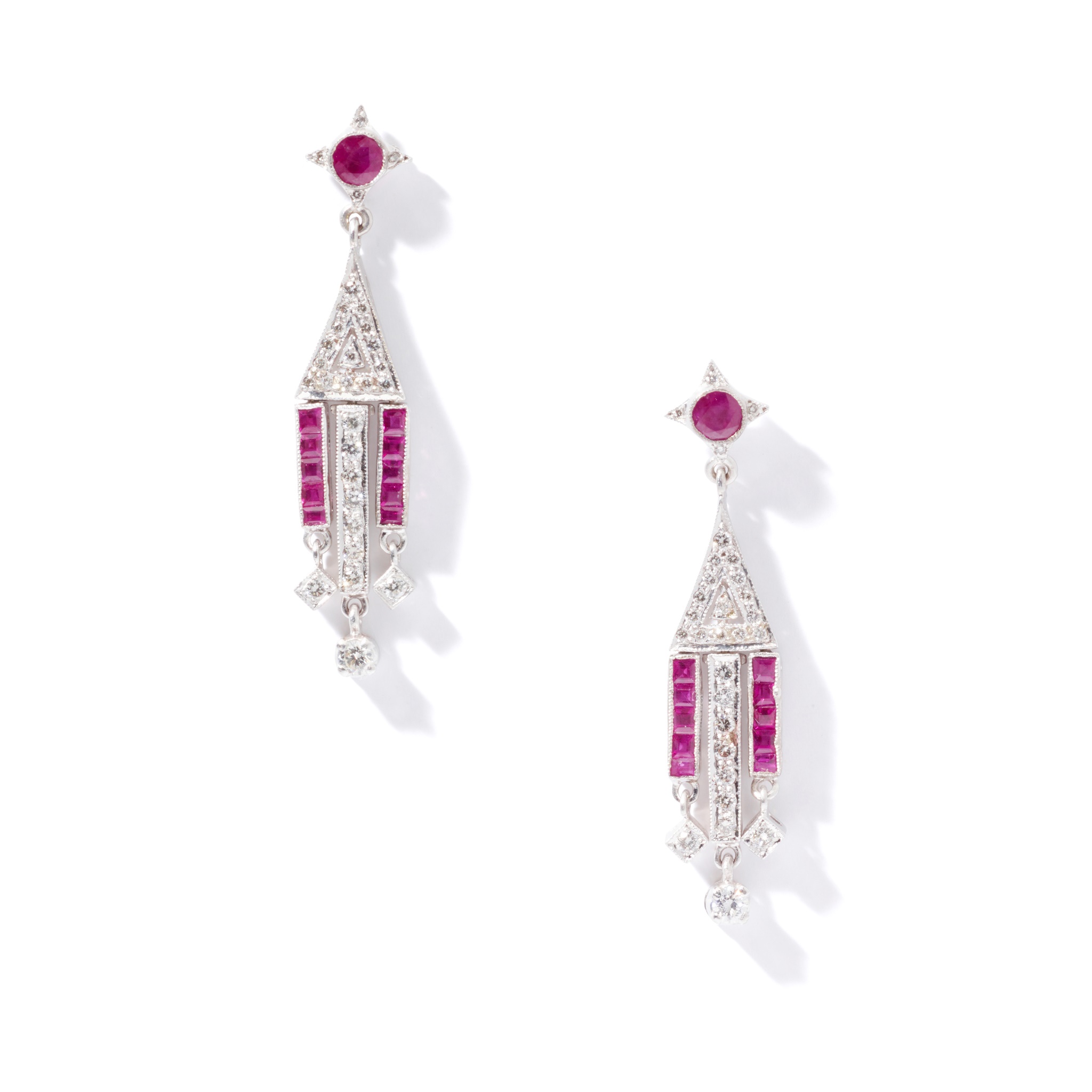Each pierced triangular plaque suspending a triple line drop, set with calibré-cut rubies and brilliant-cut diamonds, to a circular-cut ruby and diamond surmount, post fittings