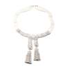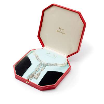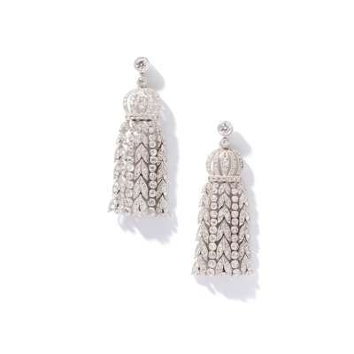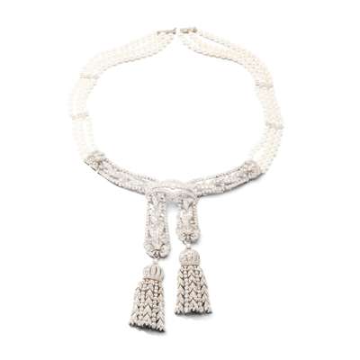 The front designed as openwork foliate and bow motifs and borders millegrain-set with rose-cut diamonds, terminating in a pair of detachable similarly-set tassels, to a later three-strand seed pearl necklace with rose-cut diamond spacers, accompanied by a later pair of old brilliant-cut diamond earstuds, for wear with tassel drops, pearls untested