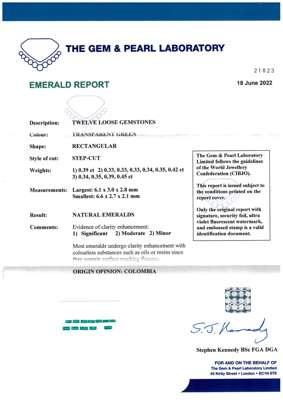 Accompanied by a Gem & Pearl Laboratory report, stating that the emeralds, weighing from 0.33 to 0.45 carats, are natural with mostly moderate and minor clarity enhancement, one with significant, and are of Colombian origin. Report number 21823, dated 18th June 2022.