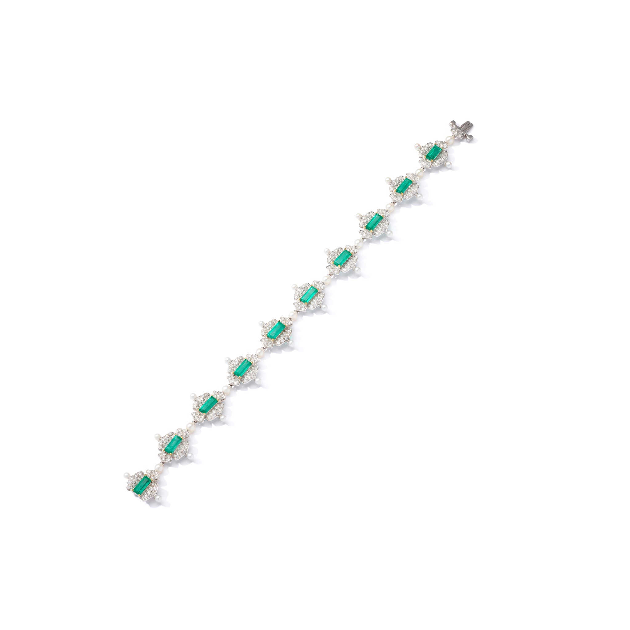 Composed of a series of quatrefoil links, each set with a rectangular step-cut emerald within pavé-set brilliant-cut diamond surround with seed pearl quarters, unsigned