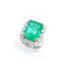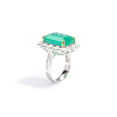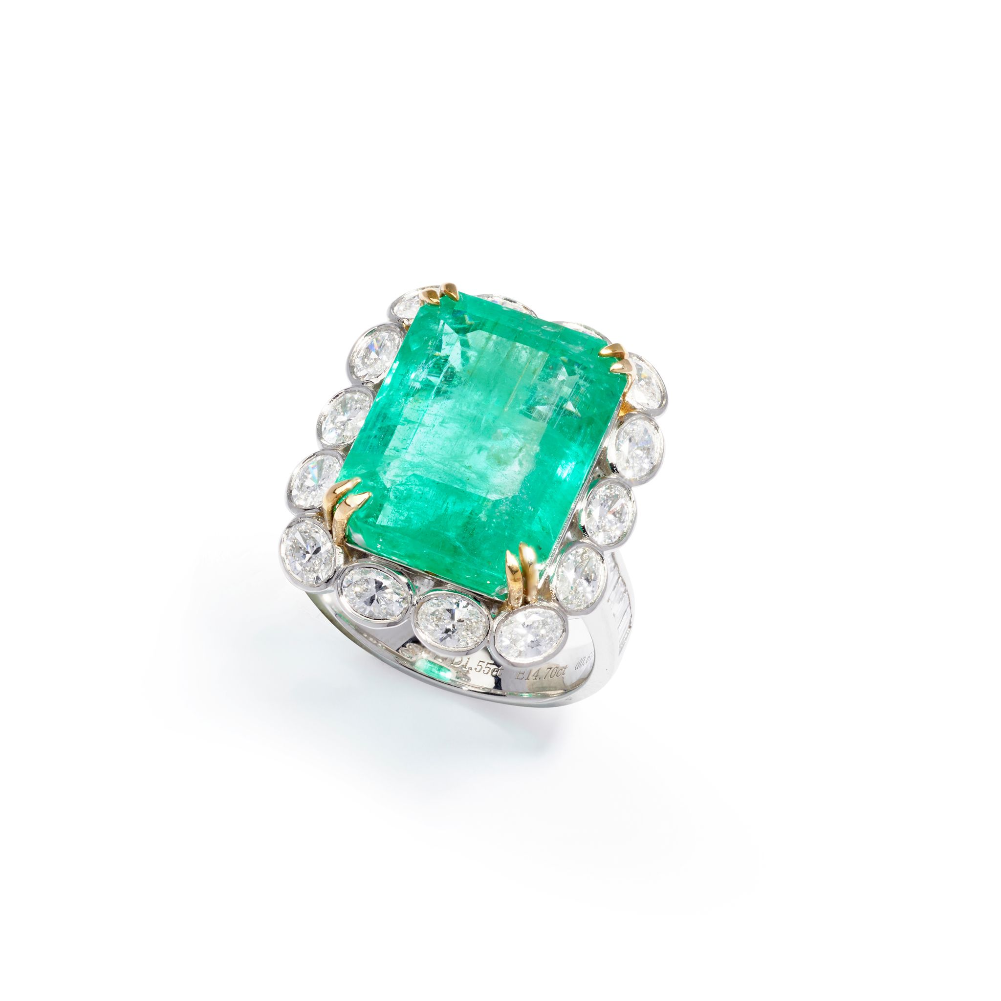 The cut-cornered step-cut emerald, weighing 14.75 carats, to an oval-cut diamond surround and diamond-set gallery, between baguette-cut diamond shoulders