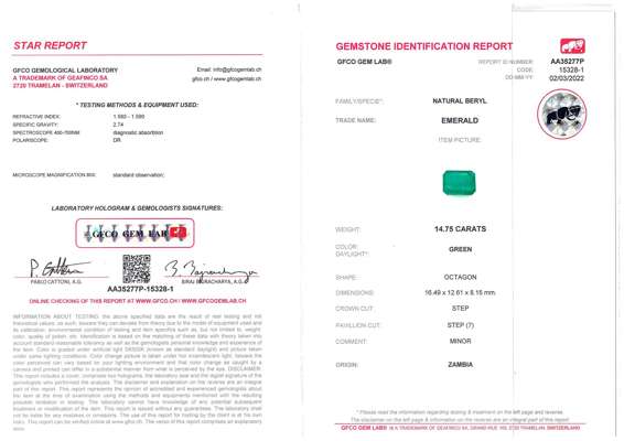 Accompanied by a GFCO Gem Lab report stating that the emerald, weighing 14.75 carats, is natural, with minor clarity enhancement, and of Zambian origin. Report no. AA35277P, dated 2nd March 2022.