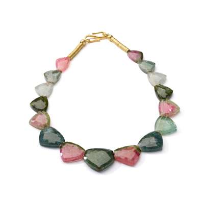 Composed of a graduated series of triangular rose-cut vari-coloured tourmalines, to an S-shaped clasp