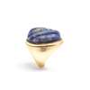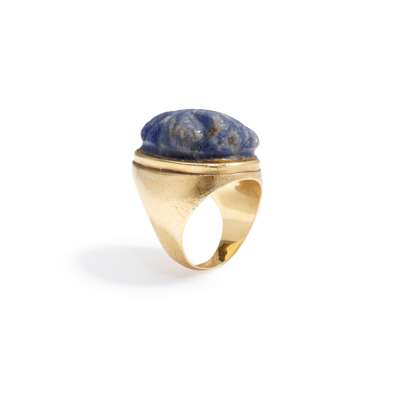 Set with a freeform carved lapis lazuli, to a tapered mount, unsigned