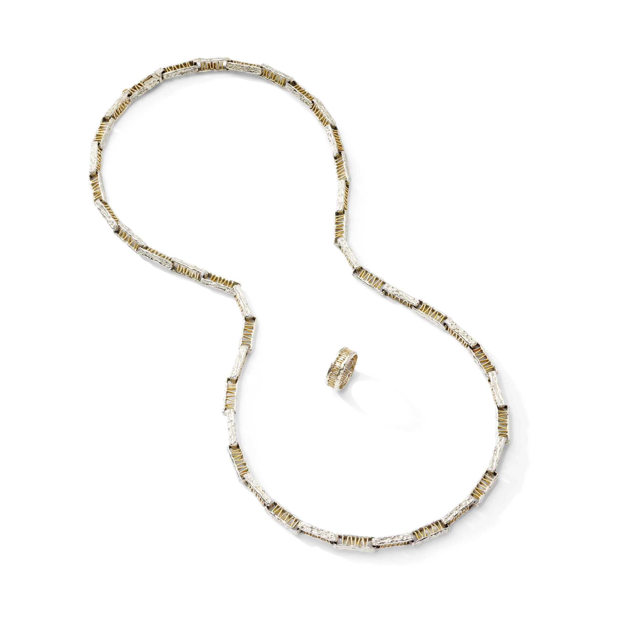 The necklace designed as textured 18ct white gold rectangular links with gold wirework centres, with a band ring en suite, signed David Thomas, numbered, UK hallmark