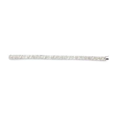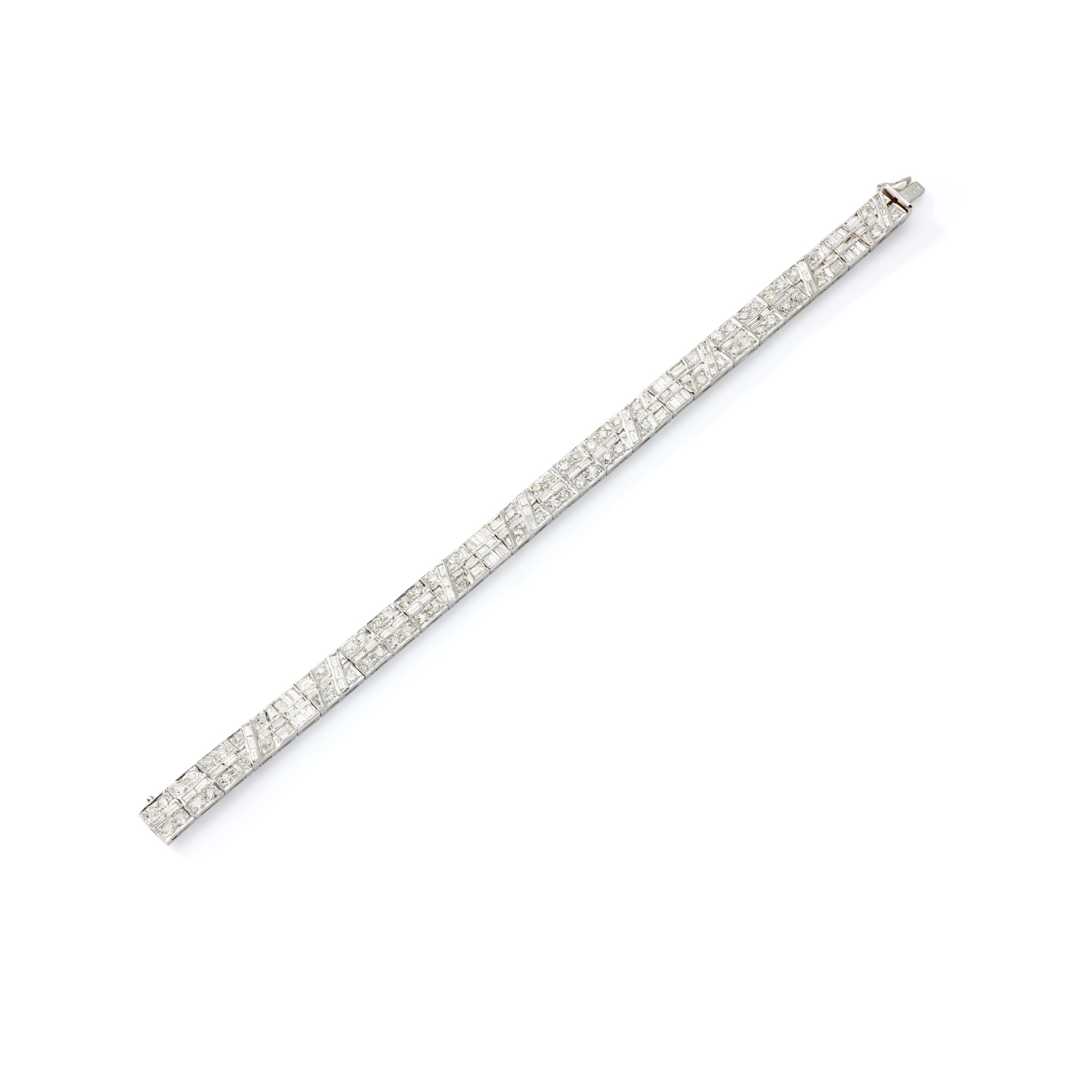 Composed of a series of rectangular links variously-set with brilliant and baguette-cut diamonds