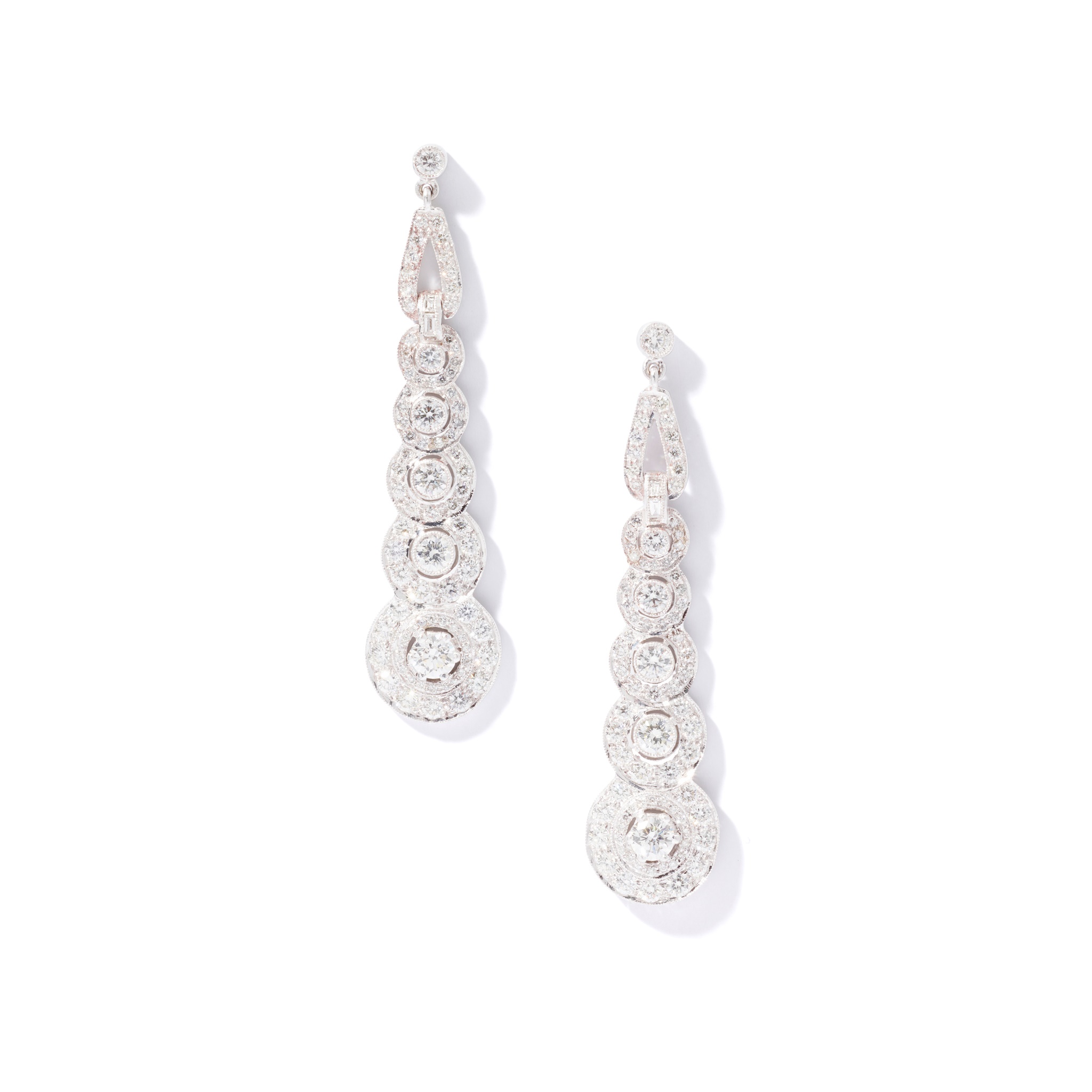 Composed of a graduated series of brilliant-cut diamonds in pierced diamond-set surrounds, to a brilliant and baguette-cut diamond surmount, post fittings