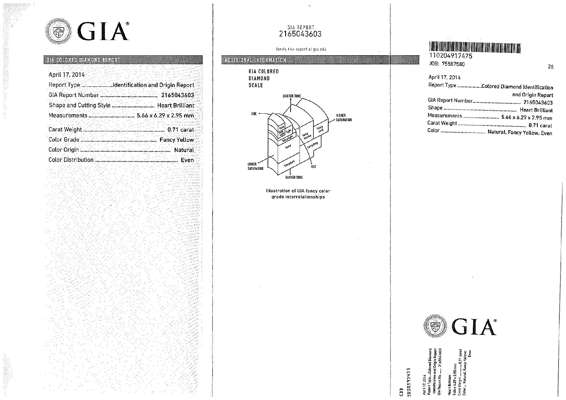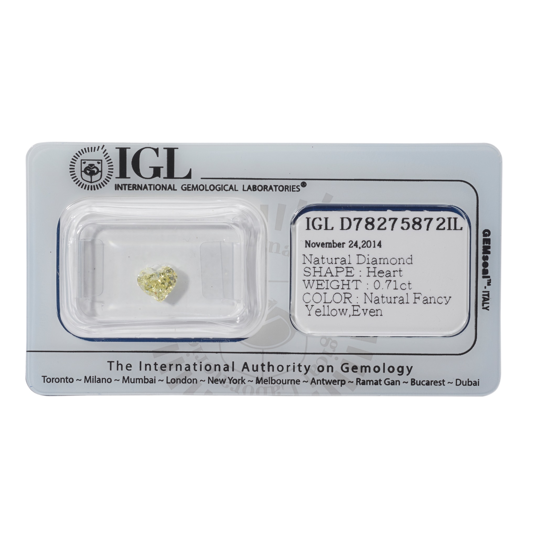 Accompanied by a GIA report stating that the heart brilliant-cut diamond, weighing 0.71 carat, is natural fancy yellow colour. Report no. 2165043603, dated 17th April 2014.