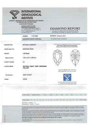 Accompanied by an IGI report stating that the modified pear-cut diamond weighing 1.04ct, is natural fancy deep brownish yellow colour, I2 clarity, with very slight fluorescence. Report no. F1P15569, dated 9th January 2012.
