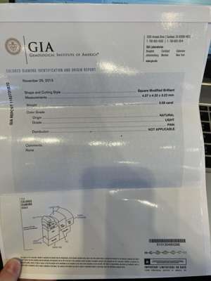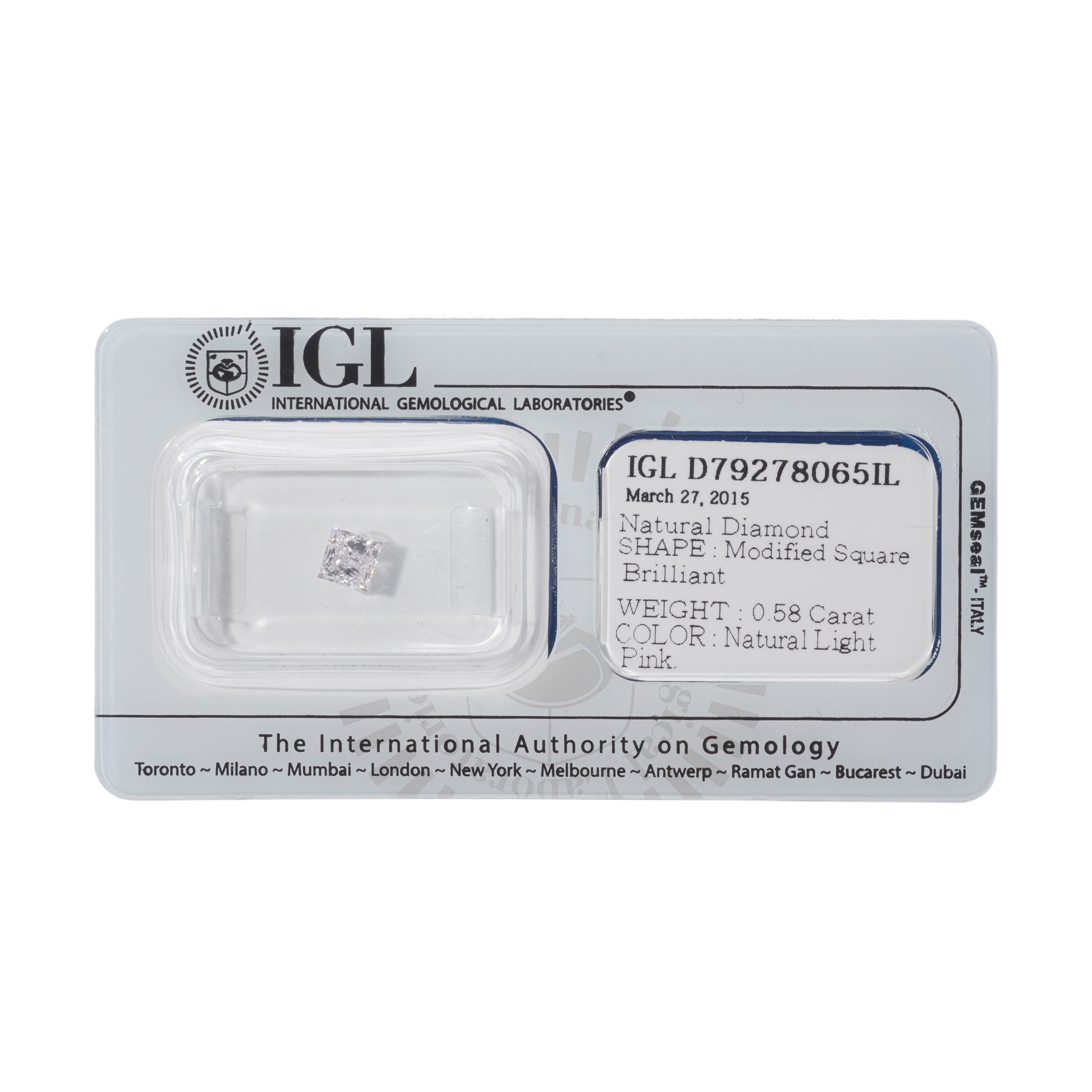 Accompanied by a GIA report stating that the square modified brilliant-cut diamond, weighing 0.58 carat, is natural light pink colour. Report no. 1152731870, dated 25th November 2013.