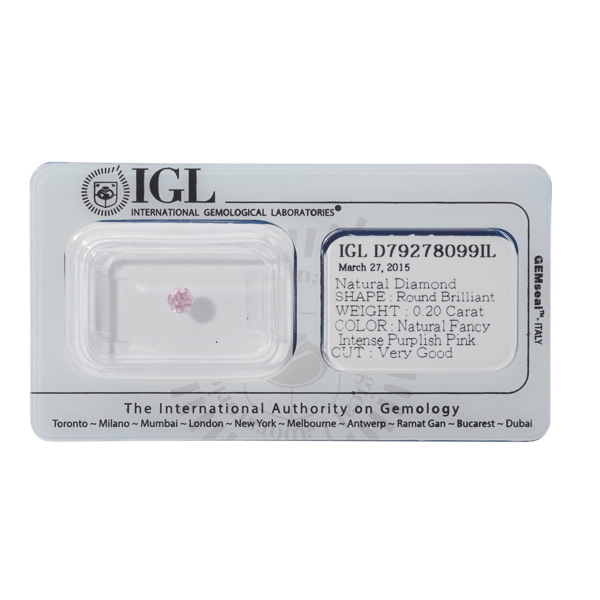 The brilliant-cut fancy intense purplish pink diamond, weighing 0.20ct