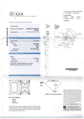 Accompanied by a GIA report stating that the rectangular modified brilliant-cut diamond, weighing 0.47 carat, is natural light pink colour, I1 clarity, fluorescence none. Report no. 2155442148, dated 3rd June 2013.