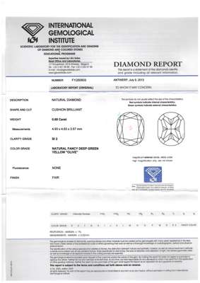 Accompanied by an IGI report stating that the cushion brilliant-cut diamond, weighing 0.68 carat, is natural fancy deep green yellow "olive" colour, Si2 clarity, with no fluorescence. Report no. F1Q50503, dated 9th July 2013.