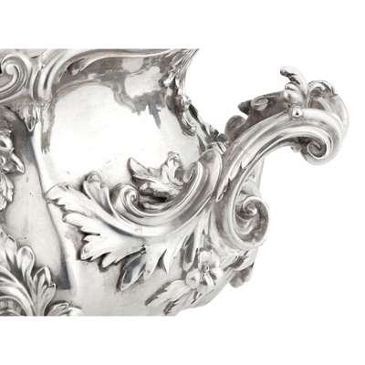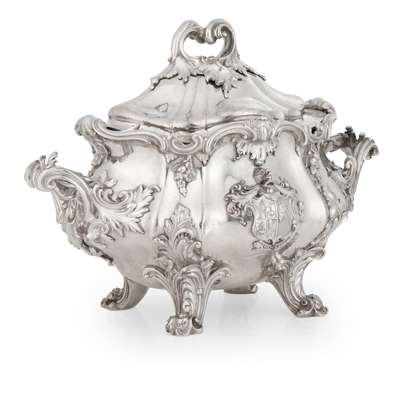 The Barnards, London 1845, of baluster bombe form, applied cast acanthus, floral and C-scroll decoration throughout, with a centrally applied marital Armorials of Campbell and Bannerman, the scroll handles with applied similar decoration, raised on four foliate bold scroll feet, the pull-off lid with an interlooped handle numbered 2, with a plain liner, loop handles