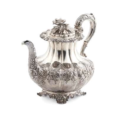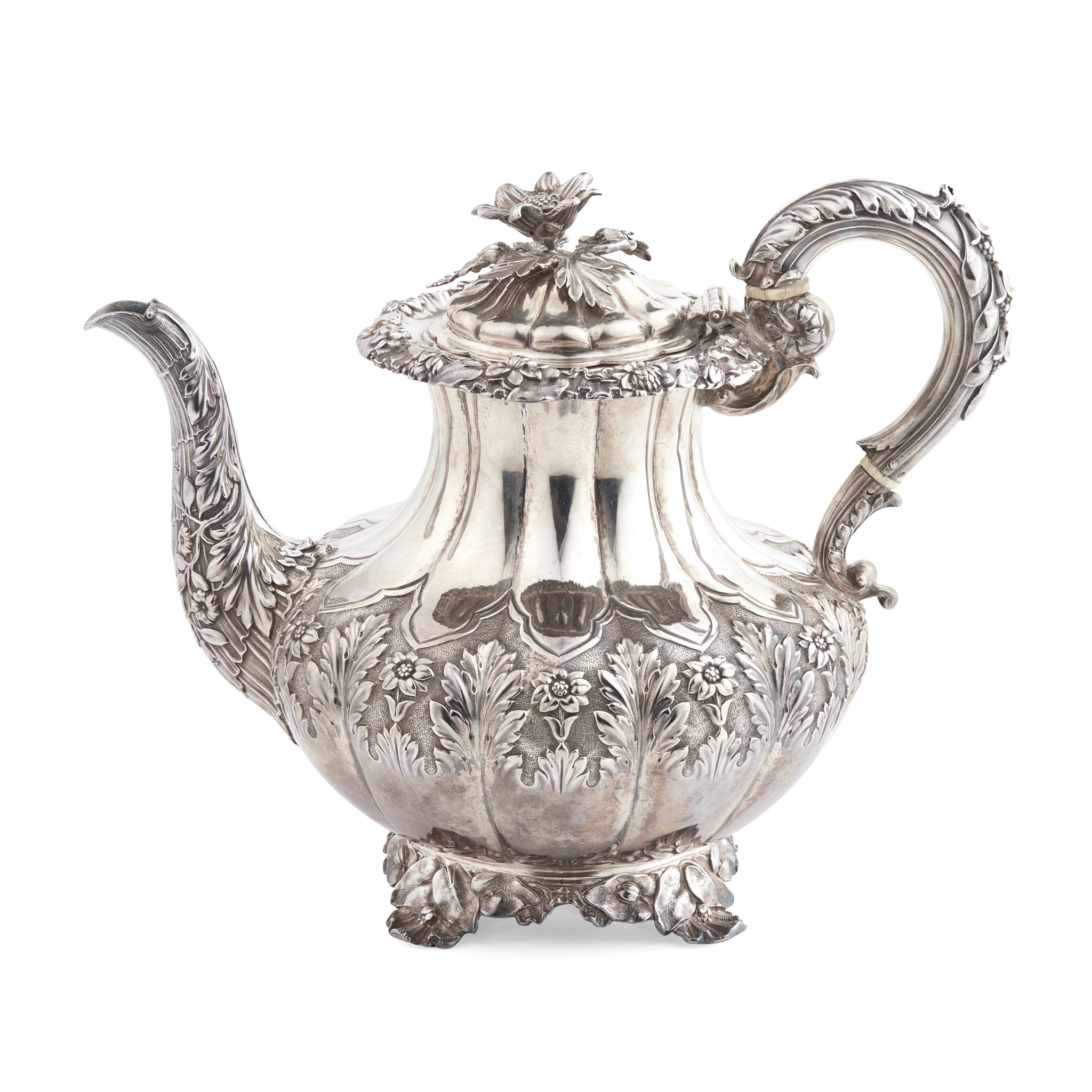 London 1827, of baluster form, the lower body with chased foliate and floral decoration to a ground border, the curved spout and S-scroll handle with similar decoration and ivory insulators to handle, the hinged lid with cast floral finial, raised on a floral bracket foot
