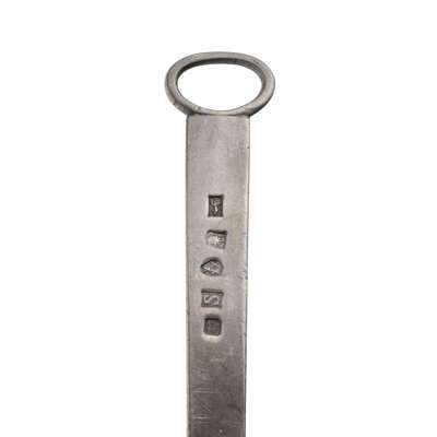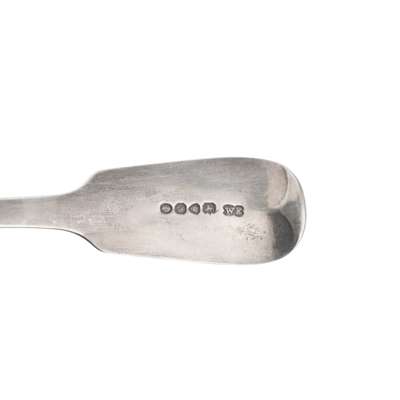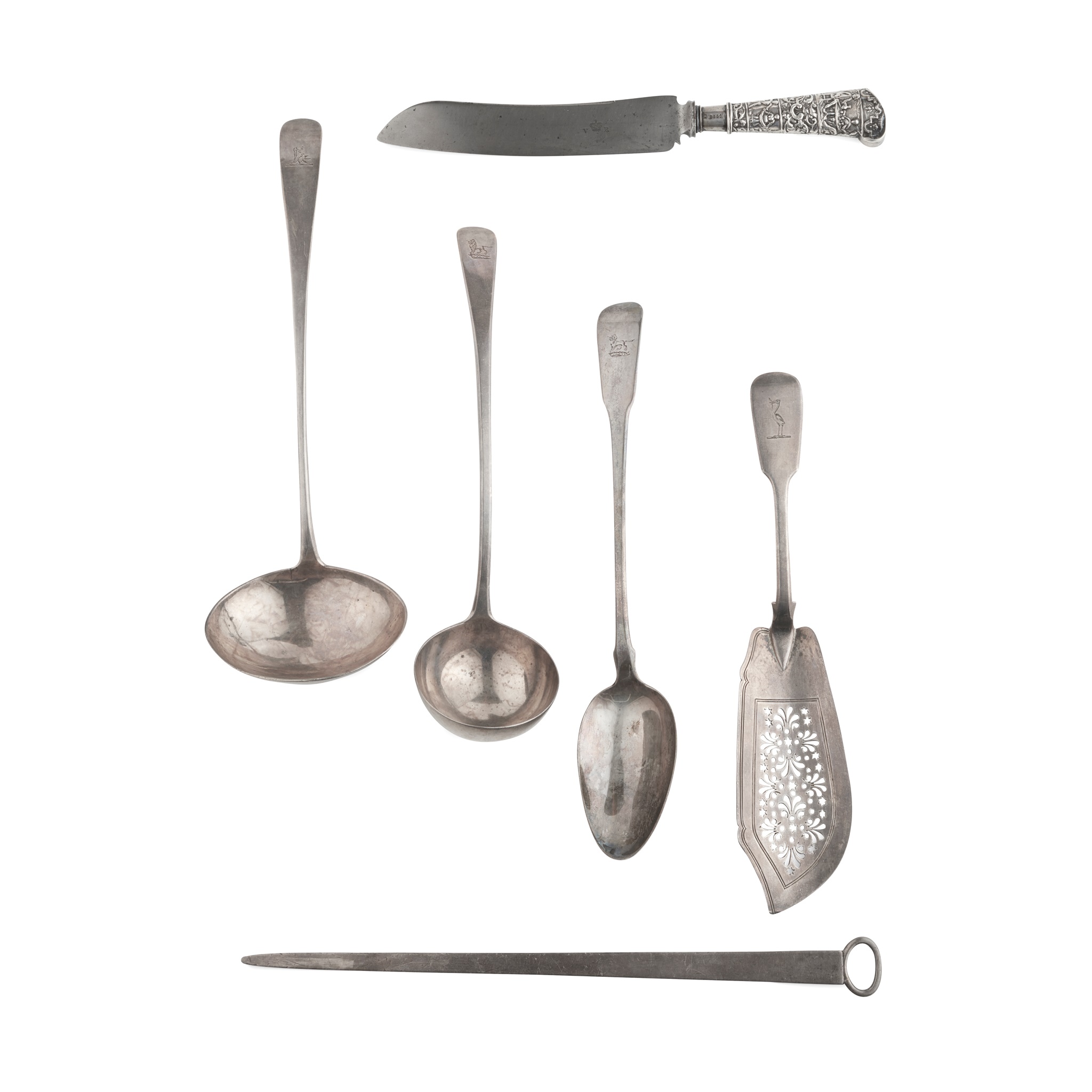 to include, a soup ladle, William Eley & William Fearn, London 1822, of Old English pattern with crest to terminal; a basting spoon, William Sumner I, London 1800, of Fiddle pattern with crest to terminal; a fish slice, William Eaton, 1836, of Fiddle pattern, crest to terminal; together with an embossed handled knife with a royal cypher to blade; a meat skewer, Newcastle 1784 and a soup ladle marked STERLING, of Old English pattern with crest to terminal