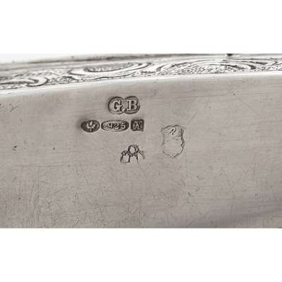 Hannau pseudo marks, with import marks for Glasgow 1907, modelled as a gondola with two oarsmen, the long narrow boat with chased scroll decoration throughout, the central covered section as a lidded box