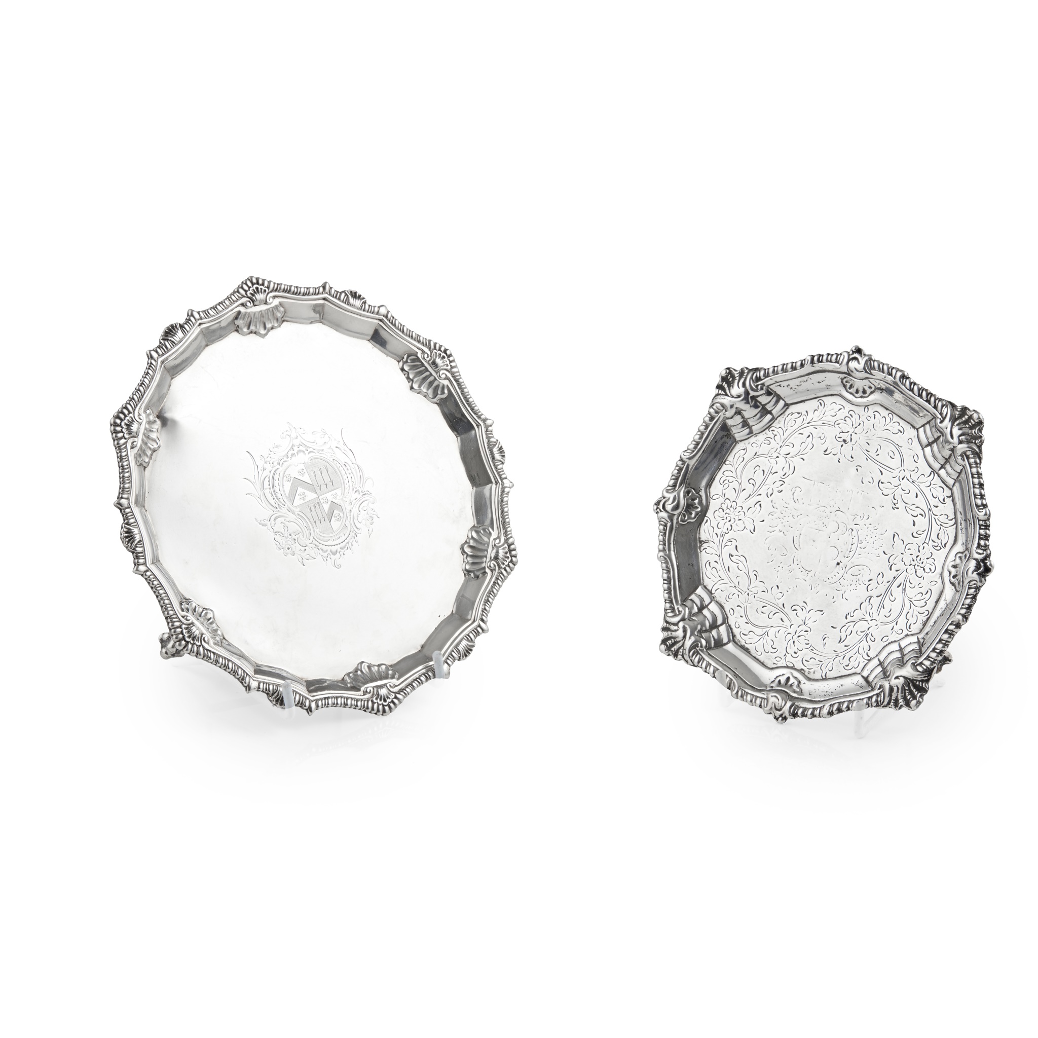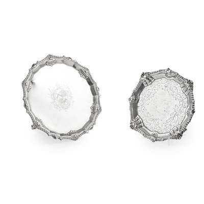 Ebenezer Coker, London 1768, of moulded circular outline with cast gadrooned and shell border, armorial engraved to centre, raised on three ball and claw feet; together with another, John Swift, London 1763, with gadrooned border and engraved floral detail to the flat, later engraved armorials to centre, raised on three hoof feet