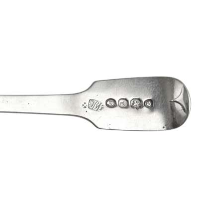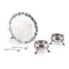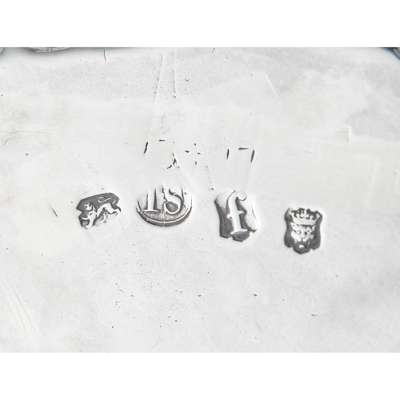 David Hennell, London 1756, each with a gadrooned rim, engraved crest to body, raised on three shell clasped feet, with two later spoons; together with a card tray, TS, London 1741, of circular outline with cast shell border, later engraved presentation inscription to centre and crest, raised on three scroll feet
