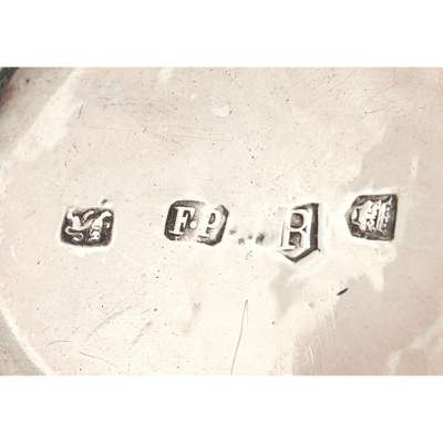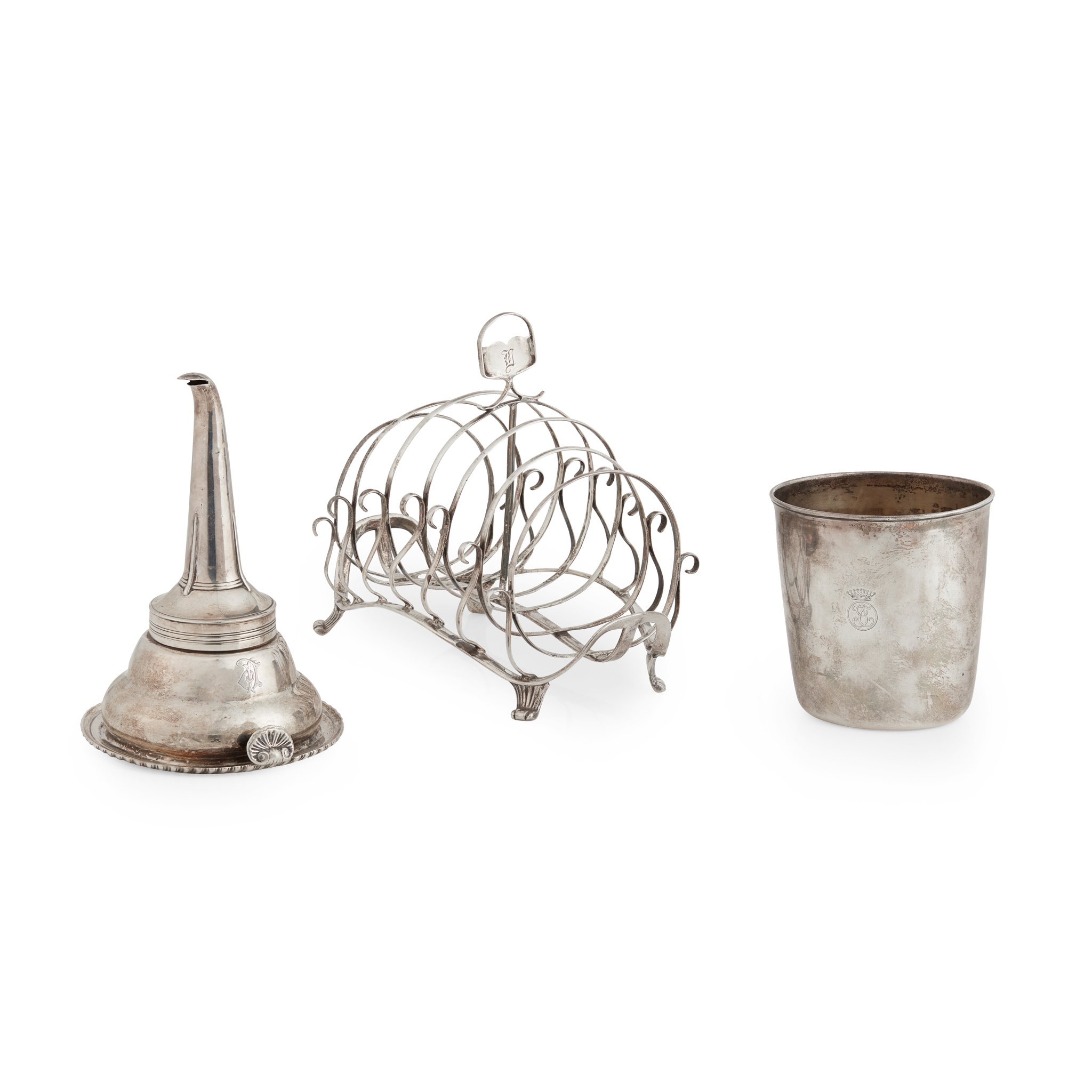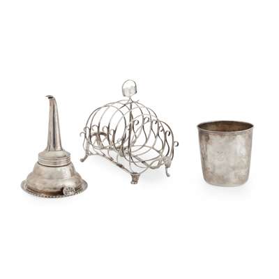 London 1732, of oval form, slightly everted rim, with later (20th-Century) engraved Viscount or Viscountess monogram; together with a George III seven bar toast rack, London 1810, of oval outline, the dividers each with scroll bar sides, raised on four paw feet; a Georgian wine funnel, with gadrooned border