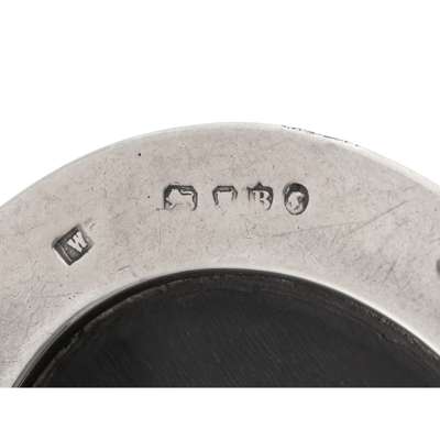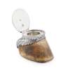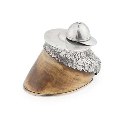 William Frederick Williams, London 1877, the hoof with naturalistically silver textured mount, the hinged lid with applied jockey's cap, with applied silver horseshoe to the underside
