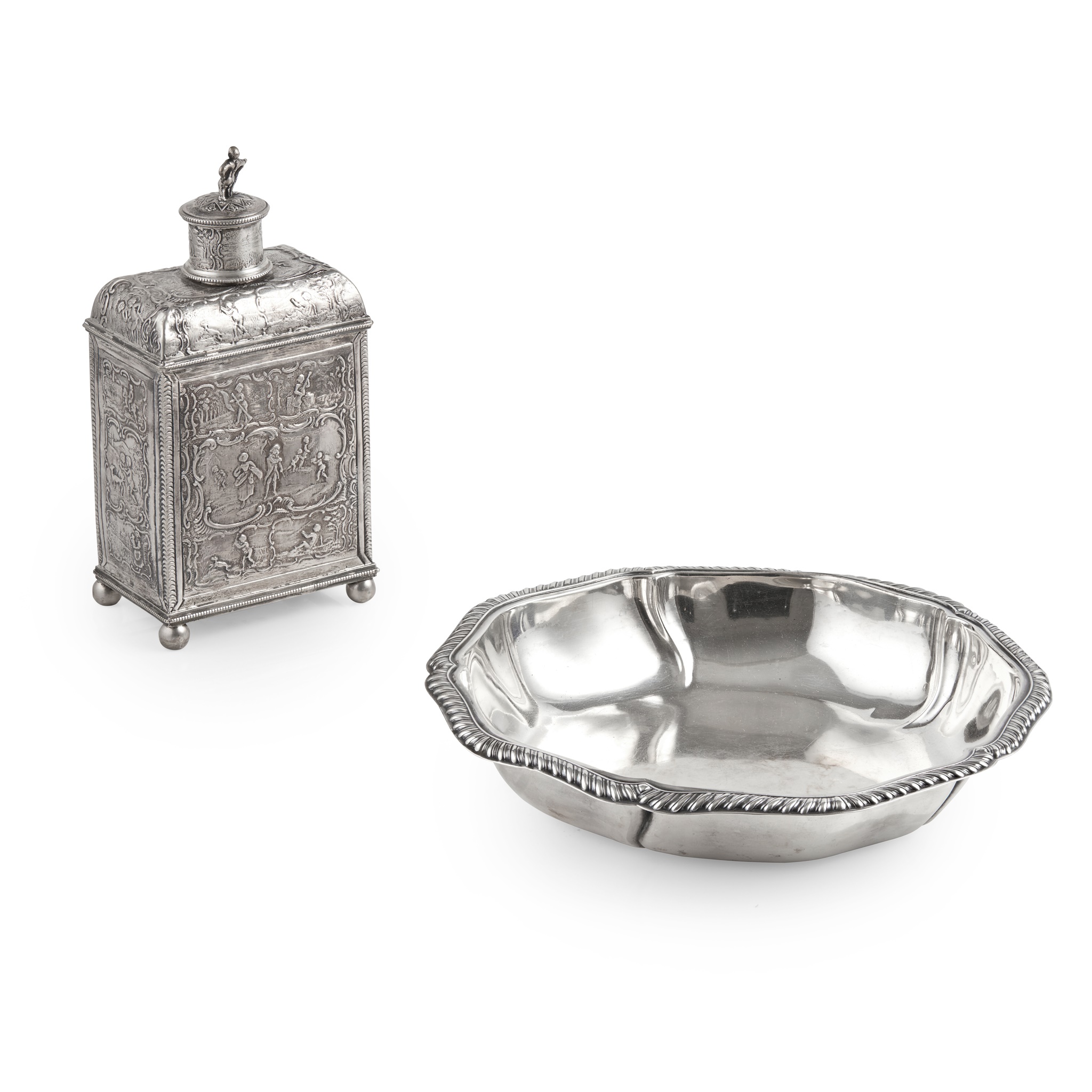 Hendrik Preyer Hoorn, Amsterdam, of rectangular outline, each panel embossed with pastoral scenes, the pull-off lid with applied figural finial, raised on four ball feet; together with a German lobed dish, with gadrooned border
