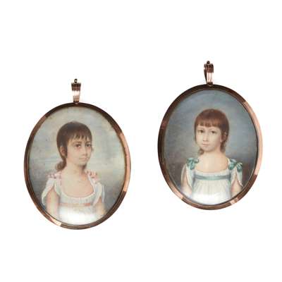 each of oval outline depicting a child wearing a white day dress, one with a blue ribbon and the other a pink ribbon, one with plaited hair to the rear, each framed and glazed with suspension loops, painted on ivory, unsigned