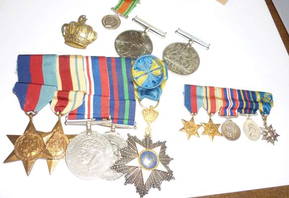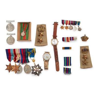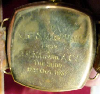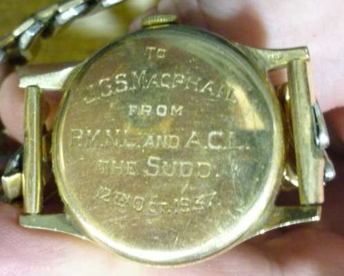 believed to have been awarded to J G S MacPhail (son of lot 144) comprising 1939-45 Star, Africa Star, British War Medal 1939 – 45, Defence Medal, Order of the Nile 5th Class (with case), with mounted miniatures; A WW2 group of two awarded to Mrs J G S MacPhail British War Medal 1939-45, Defence Medal; together with a 9ct gold Longines wristwatch silvered dial, gilt baton indicators, secondary seconds dial inscribed 'to JGS MacPhail from P.M.NL. and A.C.L. the Sudd, 12th Oct 1937' to reverse; another Longines 9ct gold cased wristwatch, white enamel dial, Arabic numerals, subsidiary seconds dial, both engraved inscriptions to J. G. S. MacPhail …… The Sudd, October 1937; pair badges Northern Province; and others, epaulettes, WWII U.S. Army Air Force Corp Pilot Wings etc., Sudan Civil Defence cap badge