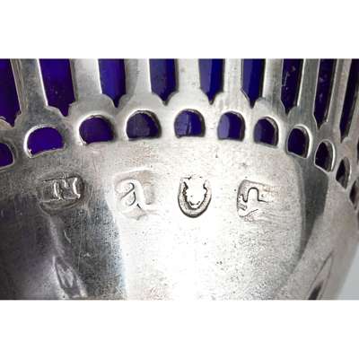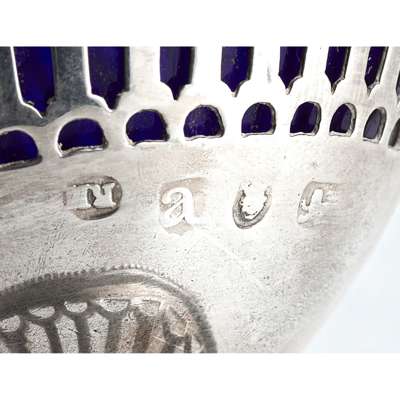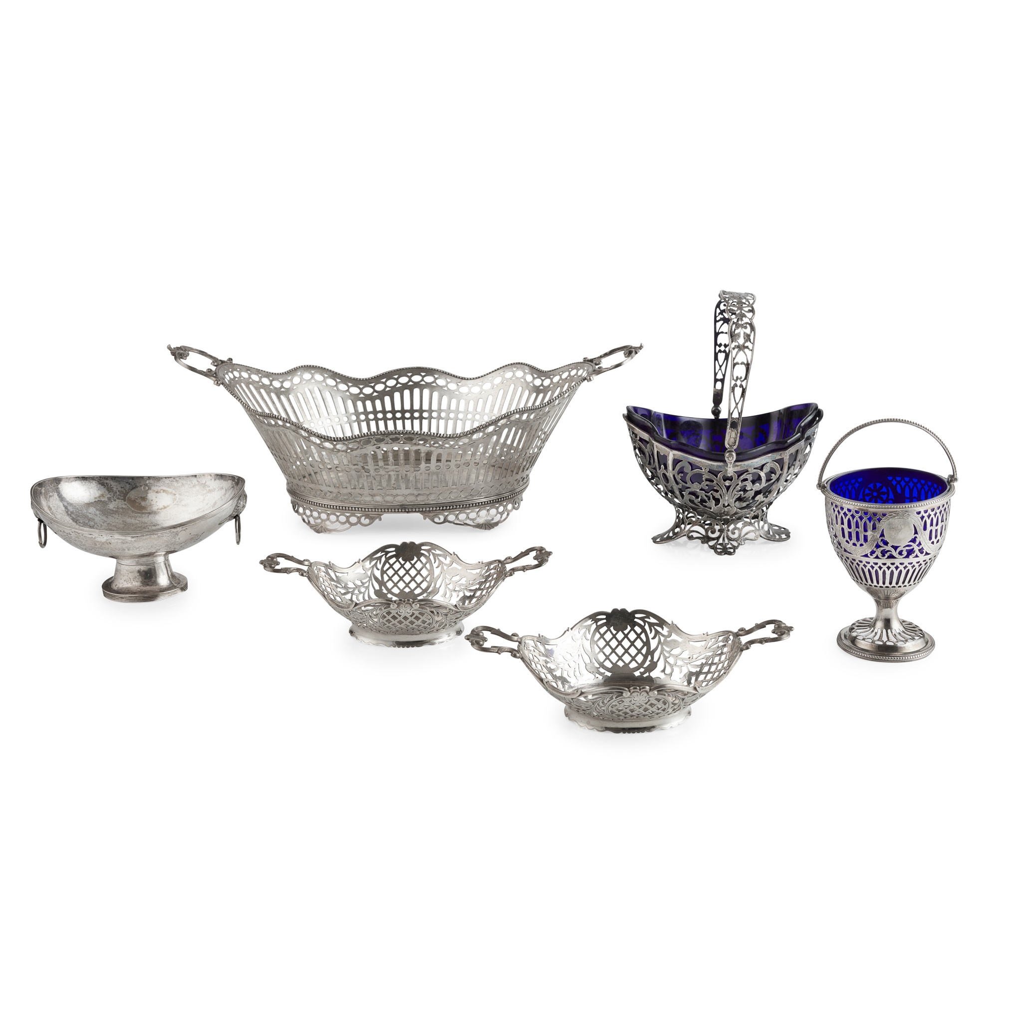 JM van Kempen & Zn., Voorschoten, of oval outline, pierced sides with undulating beaded border, the cast handles of scroll foliate form, raised on four pierced feet; together with a pair of smaller twin handled Dutch pierced baskets; various sugar baskets, including a swing-handled sugar basin, Richard Meach London 1776, with pierced sides and blue glass liner