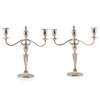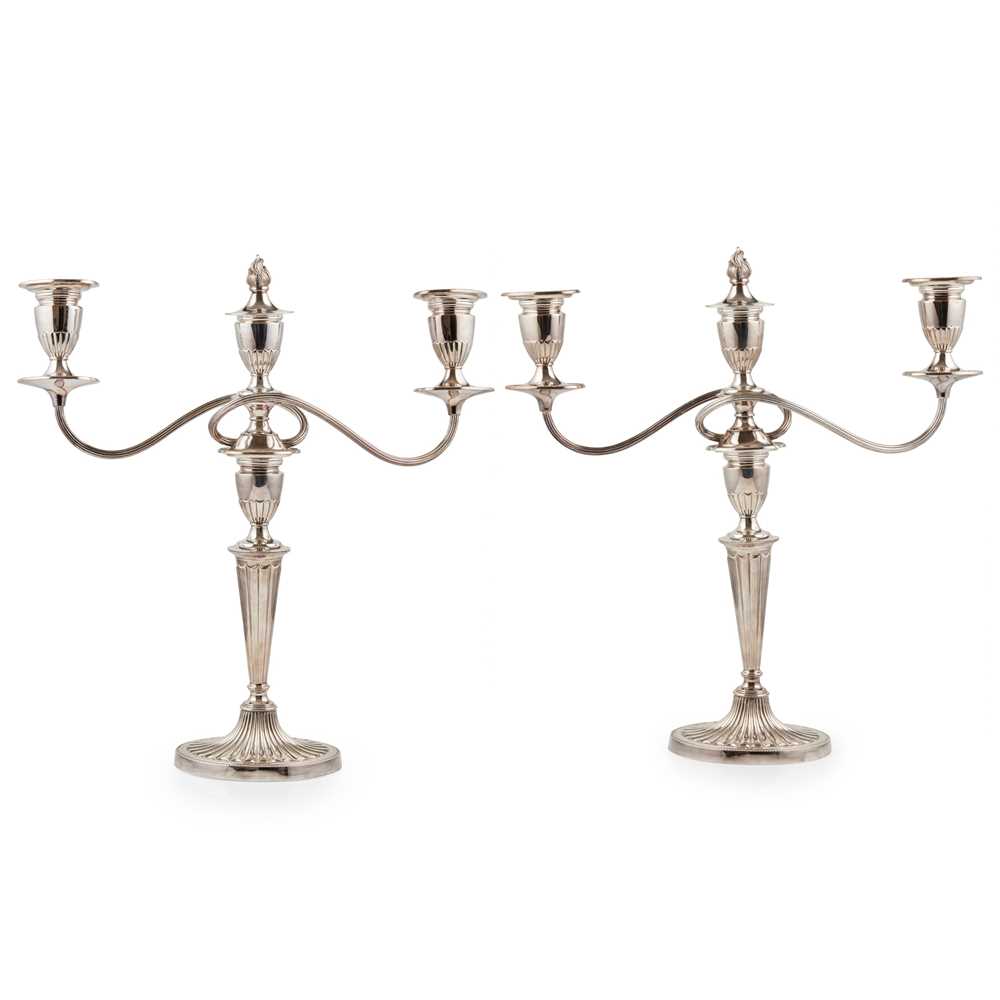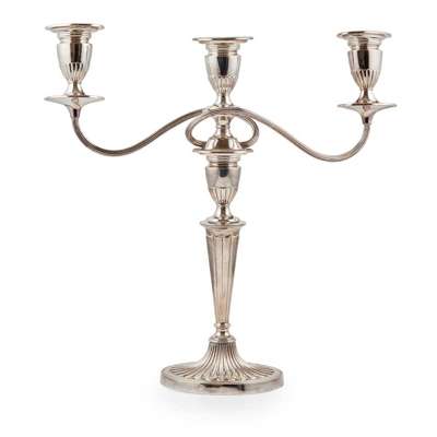 each with central fluted urn finial issuing two scroll candle branches with trumpet sconces, the fluted tapering column on spreading oval foot, with two flame finials
