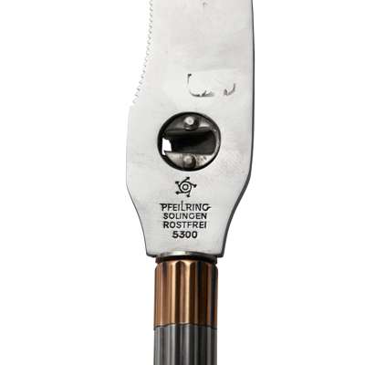 comprising, champagne tongs, bottle opener, and a serrated fruit knife, each stem of ribbed cylindrical form, with a rose gold coloured band, stamped BVLGARI, 925 to each terminal, presented in a fitted velvet case