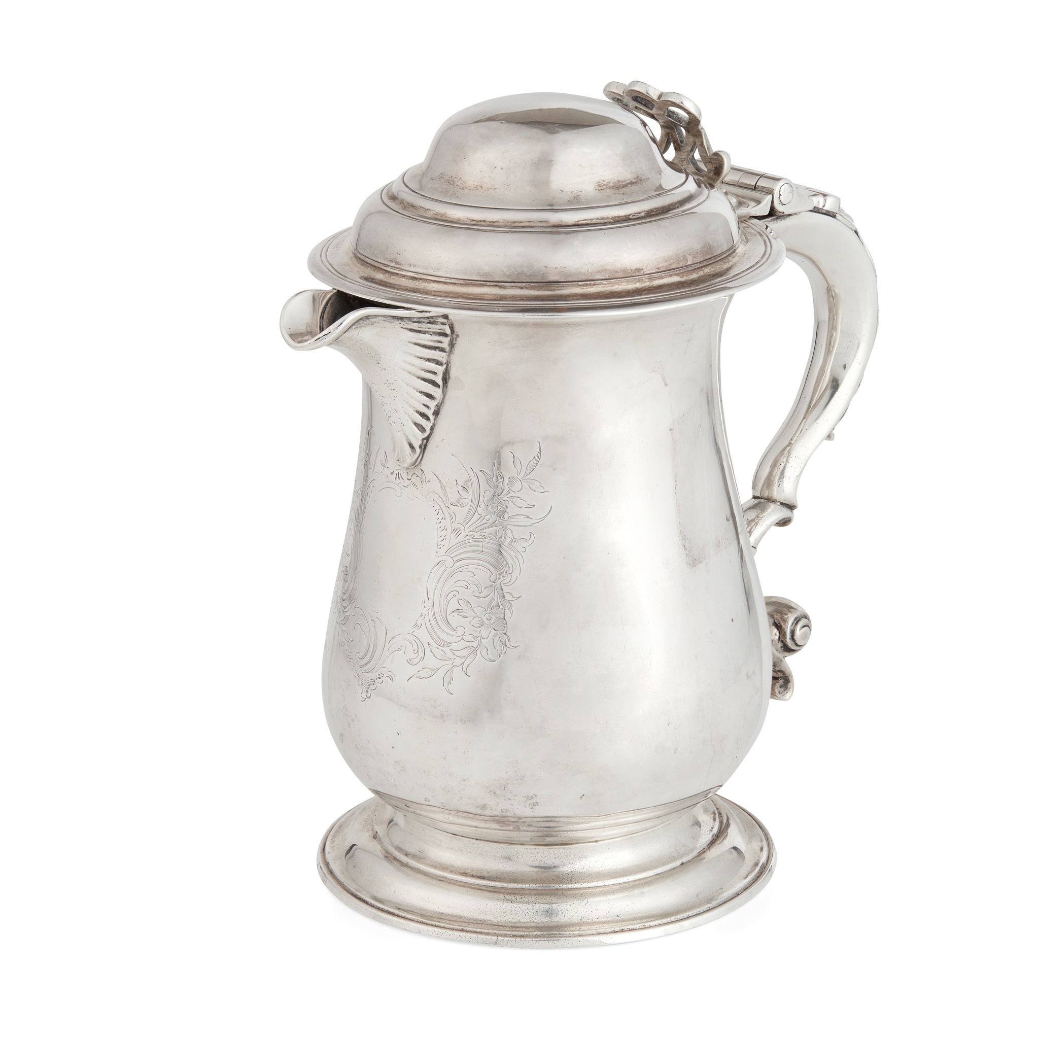London Assay Office, 2021, with cancelled marks for Thomas Whipham & Charles Wright, London 1763, of baluster form with engraved vacant floral cartouche to center, raised on a stepped spreading foot, with large leaf clasped S-scroll handle with moulded terminal and ivory insulators, the domed hinged cover with openwork thumbpiece