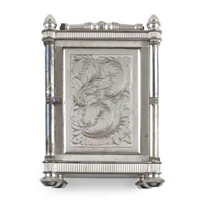 Mappin & Webb, London 1975, of traditional form, the heavy case with acorn finials, all over ribbed decoration, glazed panels, the silver dial with Roman numerals to the chapter ring and engraved basket of flowers etc., turned disc feet, the movement of 8 day English twin fusee, visible escapement, all in a fitted case with key and certificate no. 126 of 200