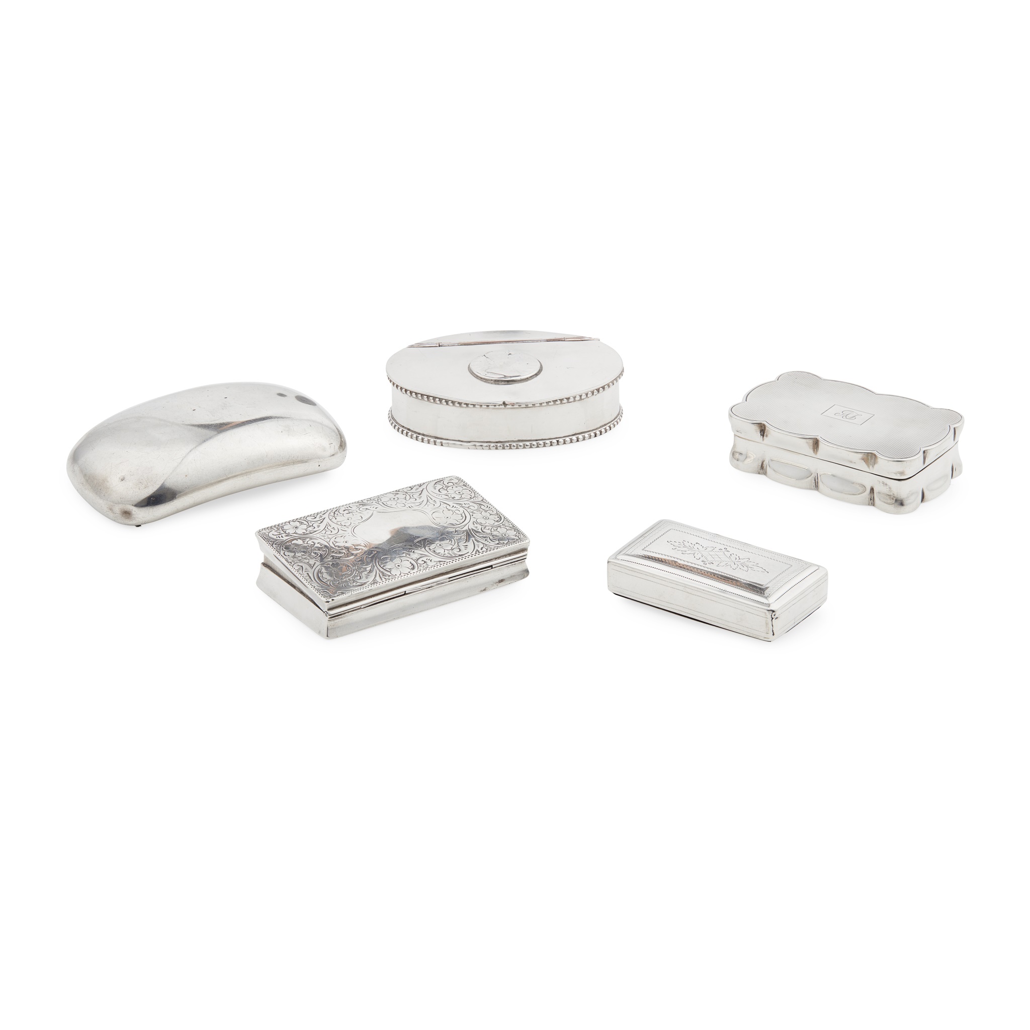 to include, William Neale, Chester 1907, with engraved initials to the hinged lid, and another, Birmingham 1906, of rectangular outline, scroll and floral decoration; one of scalloped rectangular outline, with engine-turned decoration, London 1939; together with a George IV example, Thomas Newbold, Birmingham 1825; and a plated oval snuff box with inset coin
