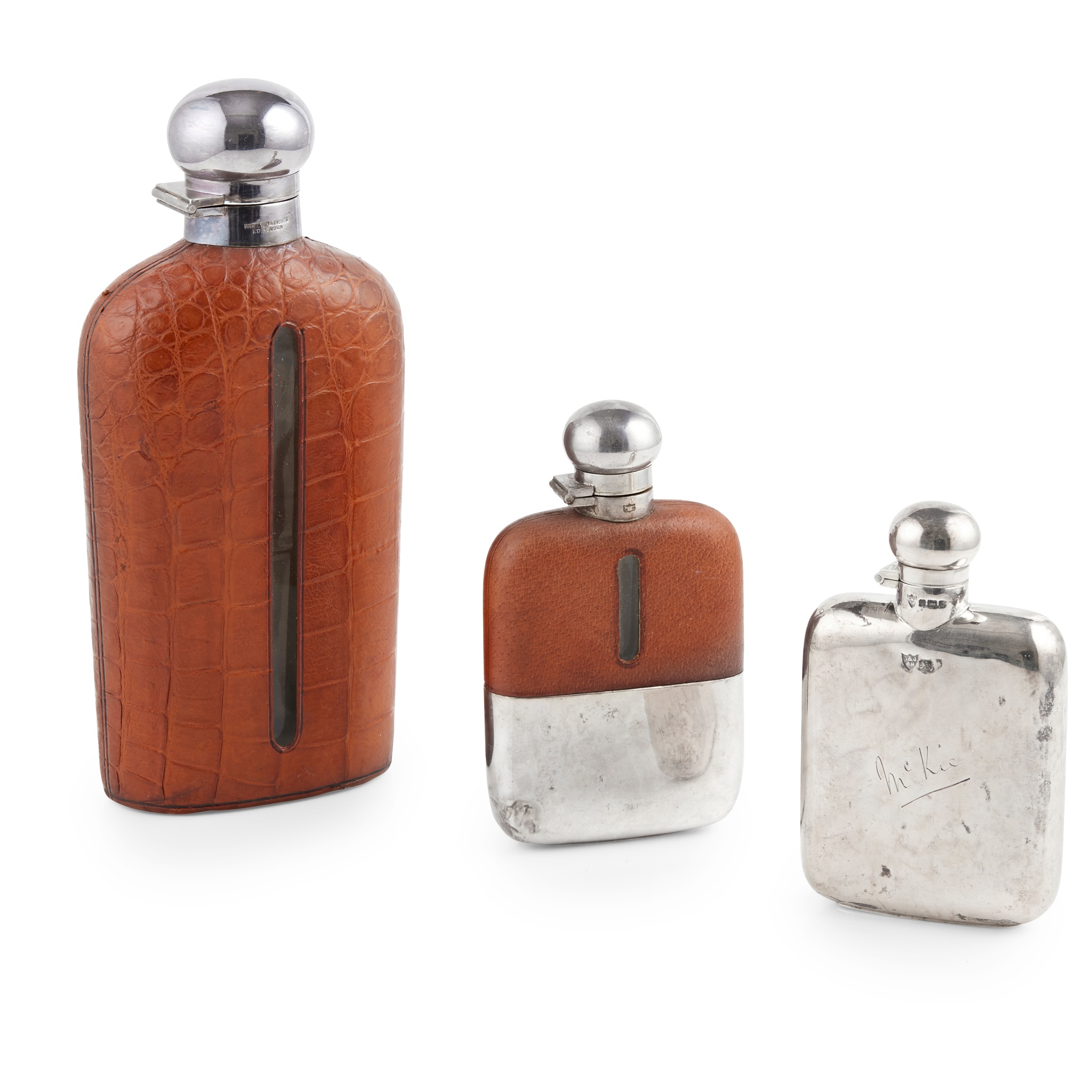 to include, G & J W Hawksley, Sheffield 1906, of rounded rectangular outline, engraved facsimile signature 'McKie' to centre, with hinged ball lid; together with a large mock crocodile leather flask retailed by Hamilton and Inches with silver-plated mounts, and a smaller silver plated example with part-leather case