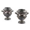 each of campana form, with detachable liners and capes, the bodies with heavy decorative bands of foliate and scroll design and with foliate bracket handles, each standing on a spreading circular foot with similar decoration