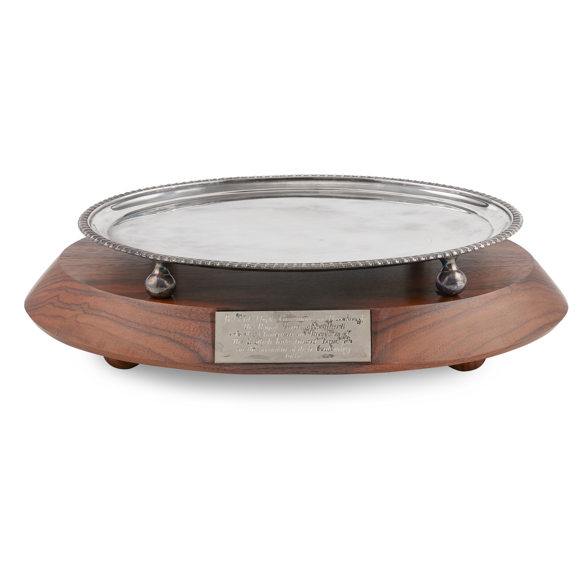 William & Patrick Cunningham, Edinburgh 1815, of oval outline with a fluted border, raised on four ball feet, presented on a fitted wooden plinth with plaque 'Presented by the Chairman and Directors of the Royal Bank of Scotland, to the Chairman and Directors of the Scottish Investment Trust on the occasion of their centenary 1987'