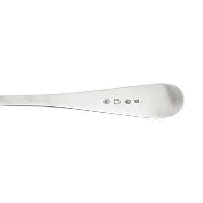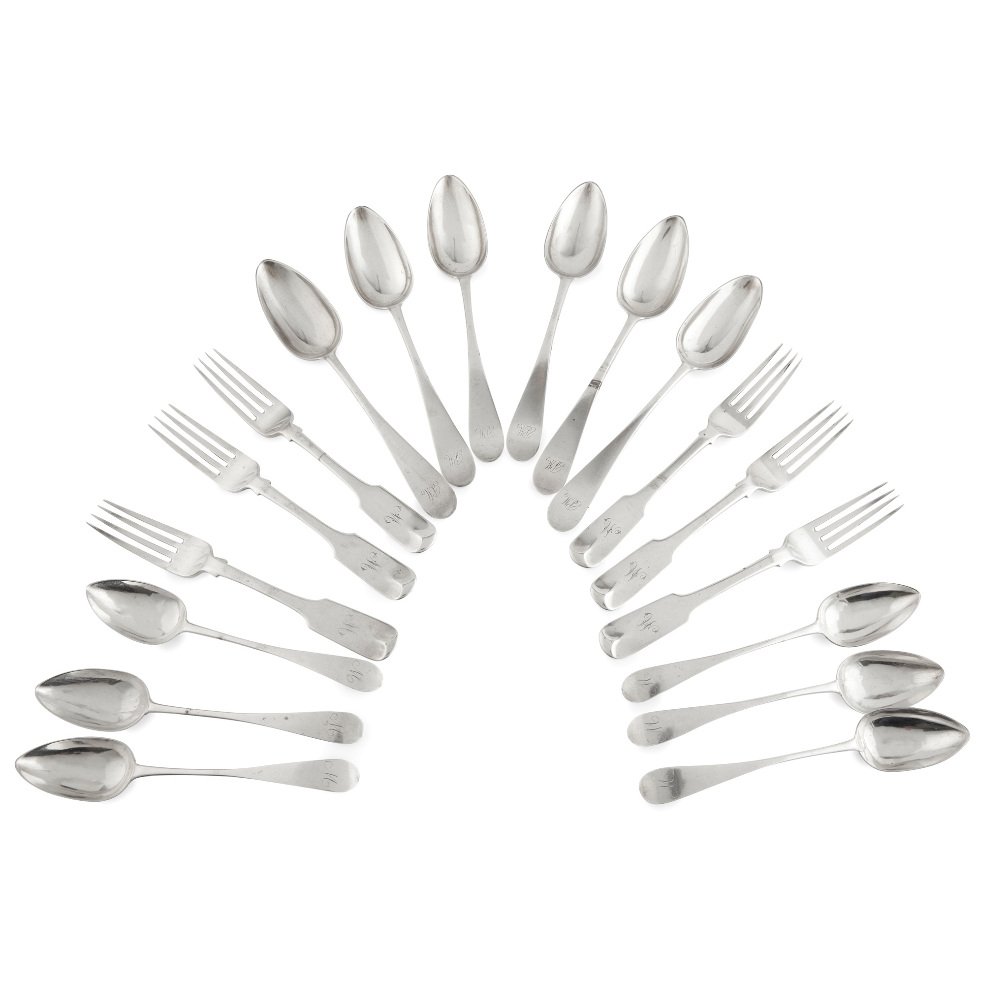 David Manson, marked DM, pot of lillies, DM, DM, of Old English pattern, initials engraved to terminal; together with a set of dessert spoons, William Ritchie, Perth, marks rubbed, of Celtic Point pattern, initials engraved to terminal; and a set of six table forks, Alex Cameron, marked CAM/ERON, C, thistle, pot of lillies, DUN/DEE, of Fiddle pattern, initials engraved to terminal
