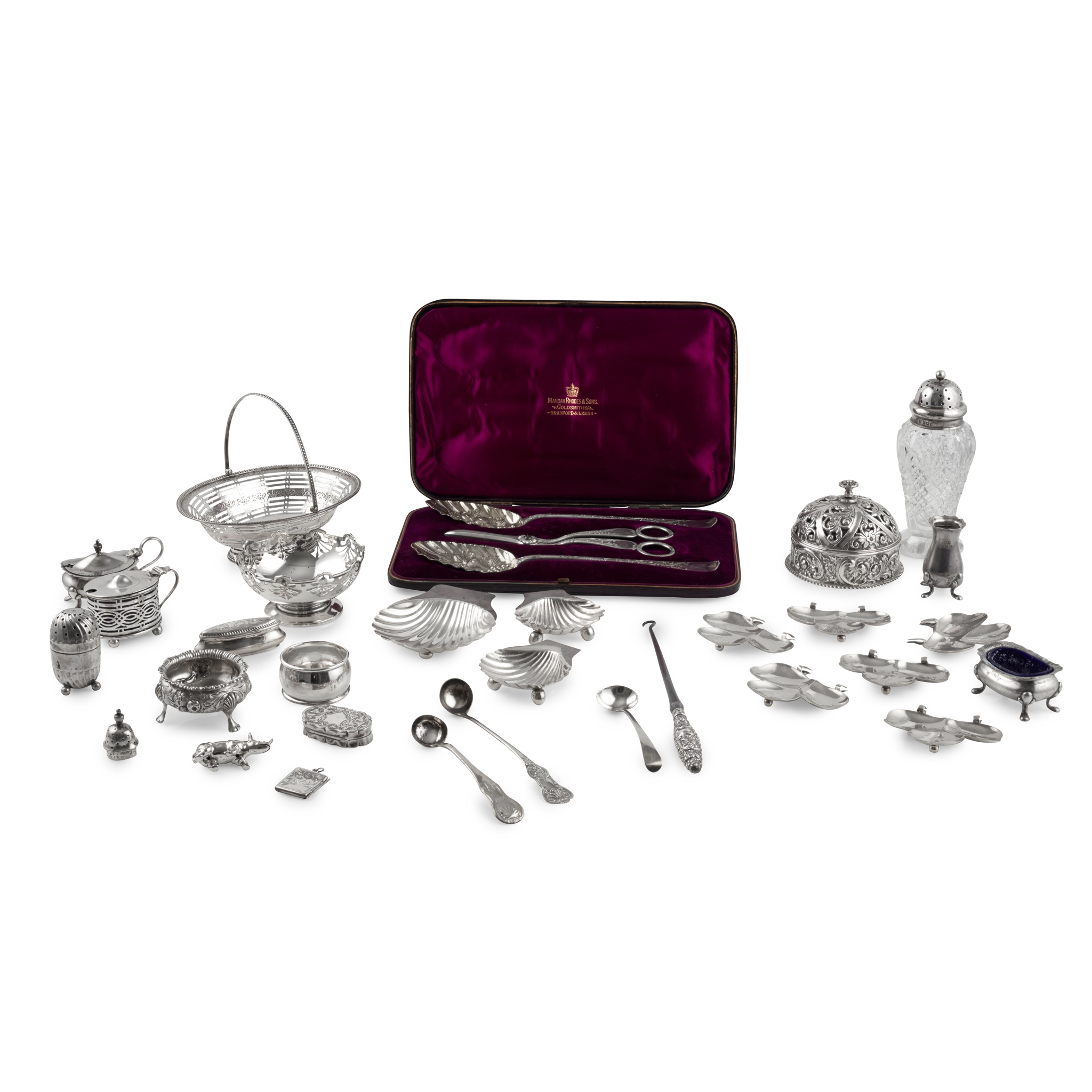 William Hutton & Sons Ltd, London 1903, of domed form, with scroll pierced detail and gadrooned border to base; together with an oval swing handled basket, Hester Bateman, London 1777, three various shell butter dishes marked 925, a cased set of berry spoons various condiments and spoons, crochet hook, pillbox, stamp box, novelty miniature rhino etc
