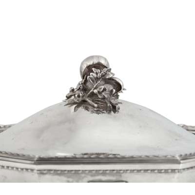 Josef Carl Klinkosch, Vienna, circa 1880, each of octagonal form, applied borders, the tureen with an embossed cartouche depicting Classical scenes including, Apollo, Centaur among others, the scroll handles with rose detail, each with octagonal insert, to a circular foot with foliate detail, the lid with foliate border, with figural mushroom and pumpkin finial and applied monogram in a mythical fashion